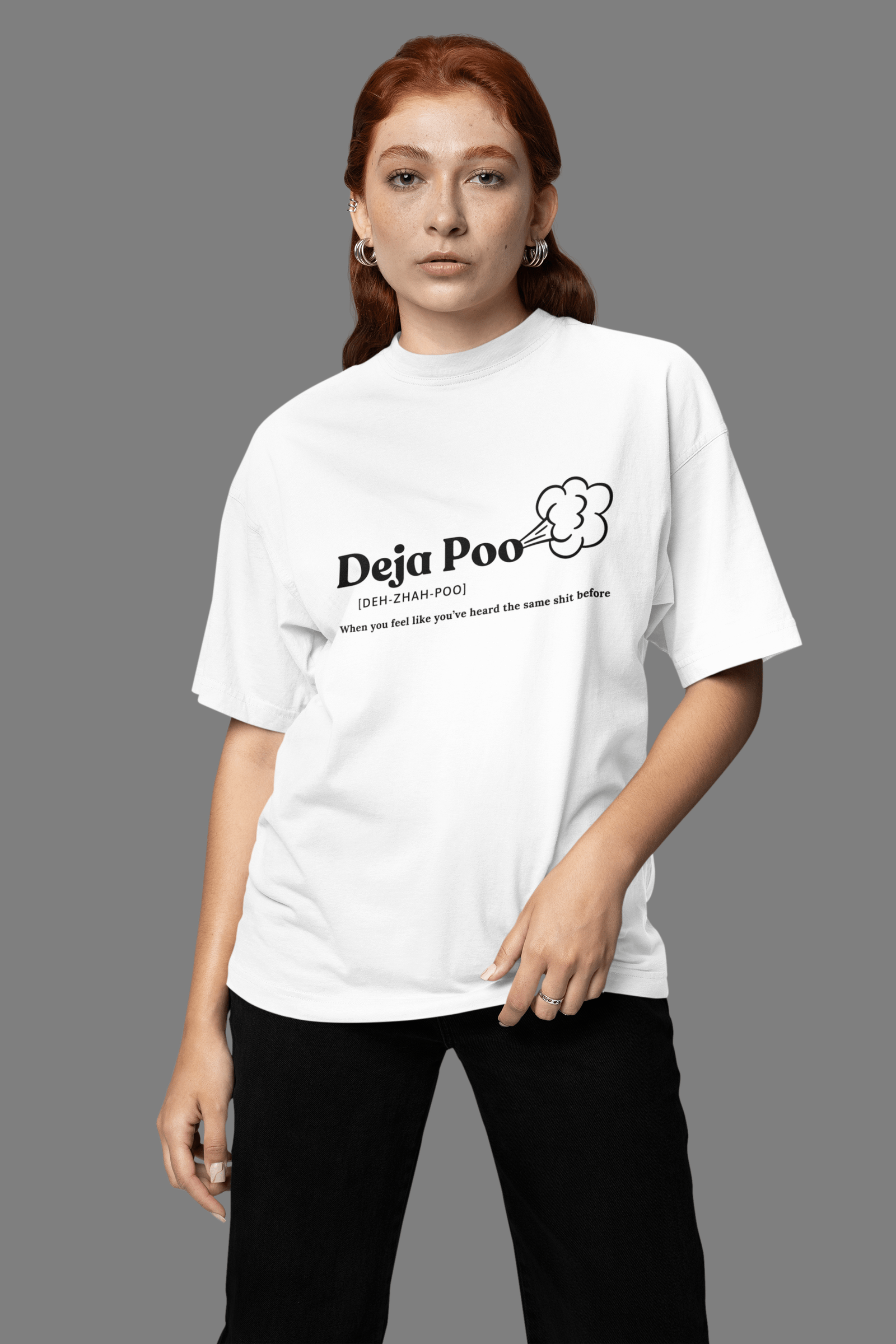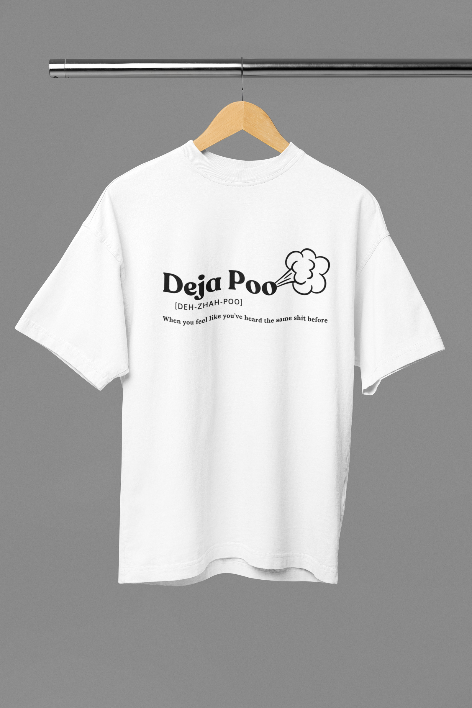 DEJA POO Classic Oversized T-Shirt – Because Some Things Never Change. Ever had that sinking feeling that you’ve heard the same nonsense before? Yeah, that’s DEJA POO. This T-Shirt delivers hilarious sarcasm with a side of streetwear flair, featuring a dictionary-style breakdown of ‘Deja Poo’ for those who appreciate wit, wordplay, and effortless comfort.